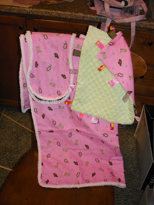We have two nieces that are arriving in June. Our sister-in-law Joni and our sister-in-law Allison are both expecting. I asked Joni what she wanted and she requested that I make one of my cute blankets. So I decided to do a taggie, two burp cloths, and a blanket for both Joni and Allison. I was going to wait to give them out but I'll let the cat out of the bag now so Melissa can see them. I was telling her about them the other day.